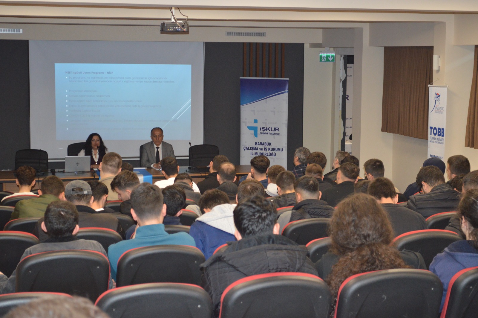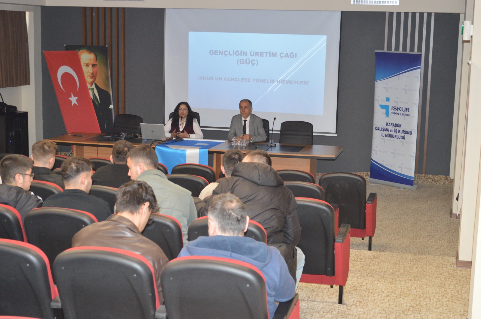 Karabük Üniversitesi TOBB Teknik Bilimler Meslek Yüksekokulu, öğrencilerin eğitim aldıkları teknik alanlarda iş gücü piyasasına hızlı ve donanımlı bir şekilde katılmalarını desteklemek amacıyla Karabük İŞKUR İl Müdürlüğü ile GÜÇ (Gençliğin Üretim Çağı) Projesi kapsamında öğrencilerin kariyer planlamalarına destek olmak ve istihdam olanakları hakkında bilgilendirmek amacıyla anlamlı bir etkinliğe ev sahipliği yaptı. Düzenlenen bilgilendirme seminerinde, “Geleceğim Meslekte” programının detayları öğrencilerle paylaşıldı.